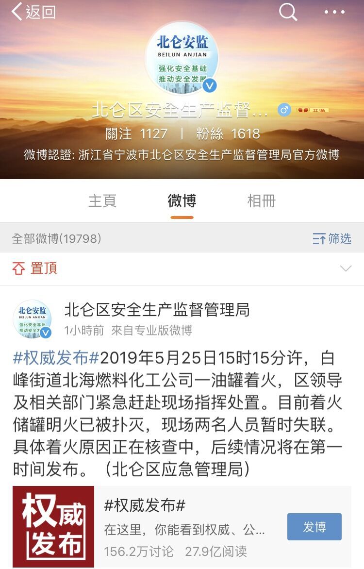 5月25日15时15分许,浙江省宁波市北仑区白峰街道北海燃料化工公司一油罐着火。