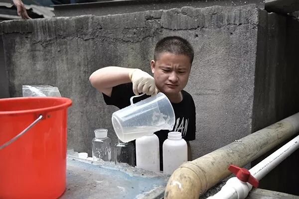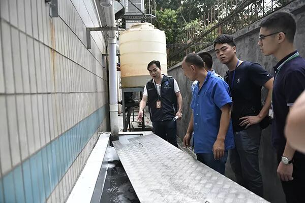 一组执法人员在南山工业城的某体育用品生产企业检查时发现,该企业的研磨粉尘废水出现管道溢流,造成了污染,执法人员现场对外排废水进行取水样检测,并依法对研磨车间进行查封。