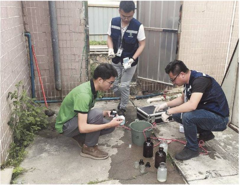 ▲执法人员对排放口废水取样